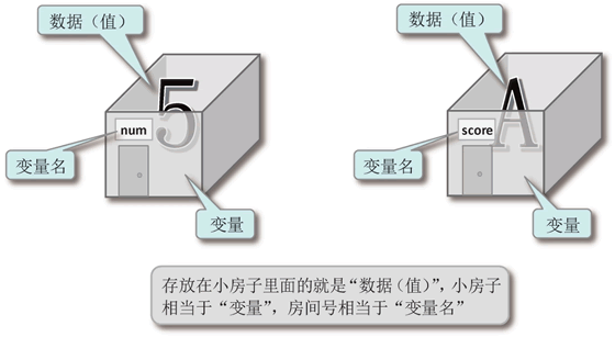 - 更多房间内存放的数据会经常改变,开始时(程序运行之初)存放的是一个数据,过一段时间(程序运行中)又换成了另一个数据,结束时(程序运行结束时)存放的也许又换了一个数据,这些存放的数据经常会变化的房间就是变量(见图 1)。