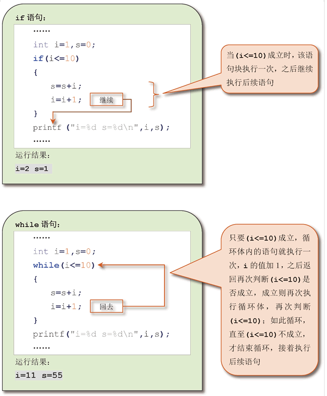 图 1:if 语句的主体只执行一次,而 while 语句的循环体可以重复执行多次