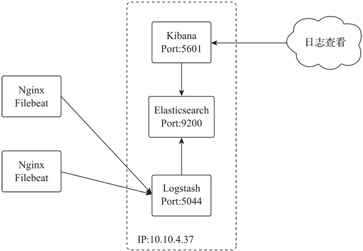 ELK 支持多种安装方式,鉴于 Docker 化部署的便捷性,本小节以基于 docker-compose 脚本的 Docker 化来部署 ELK 环境,部署示意如下图所示。
