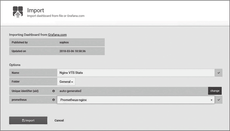 在左侧菜单点击Create→Import,在标题为Grafana.com Dashboard的输入框输入模板ID 2949后,点击任意位置进入模板导入页,如下图所示。